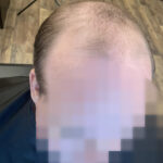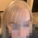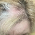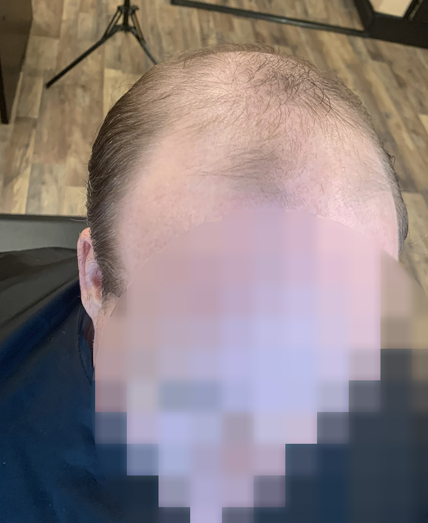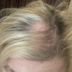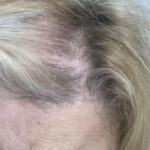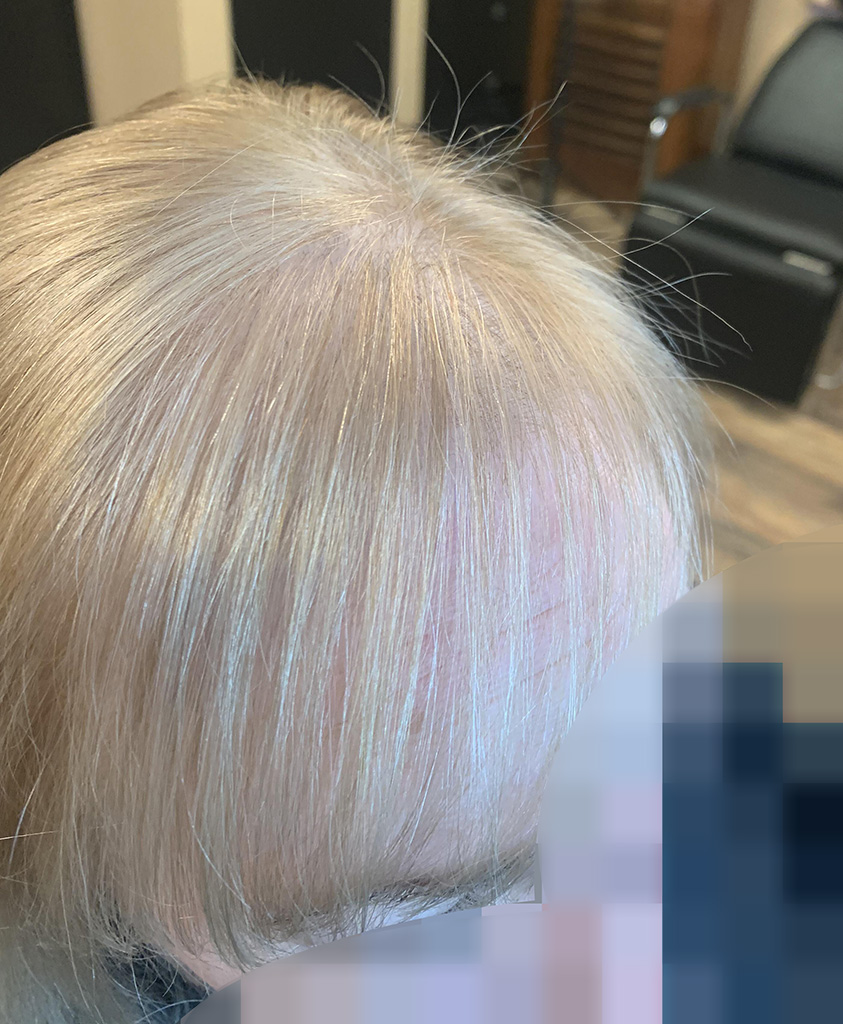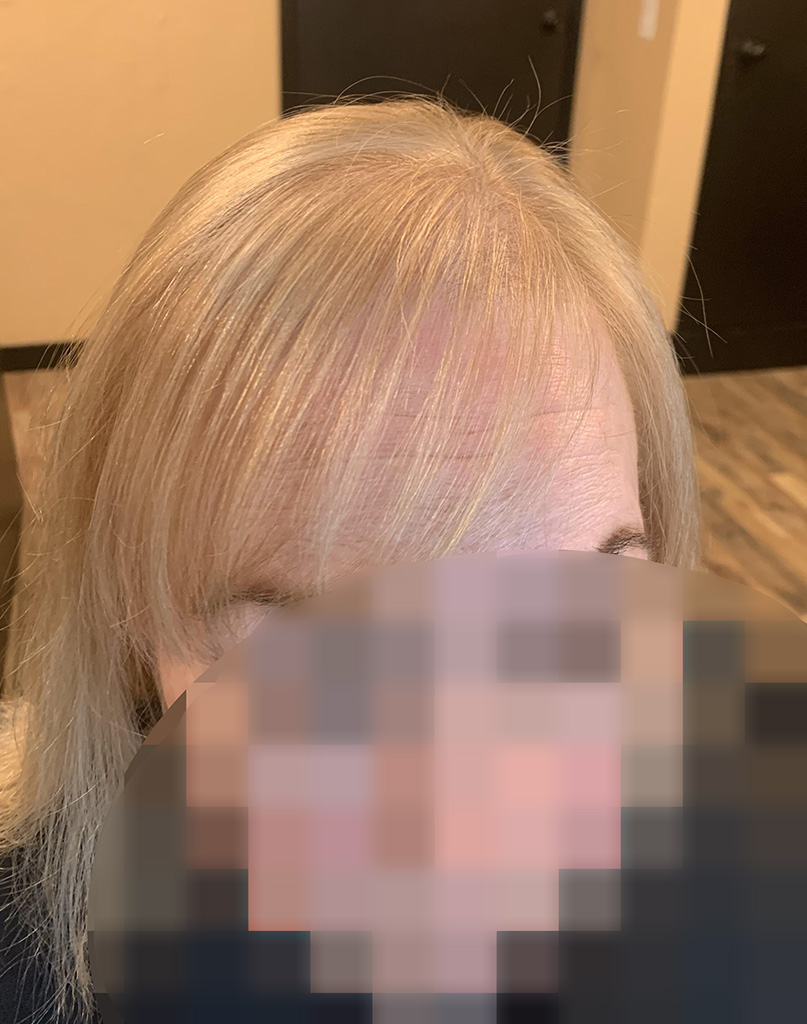 The first two photos show overall thinning of the hair. A topper in a custom color integrates seamlessly with her hair, making it undetectable.