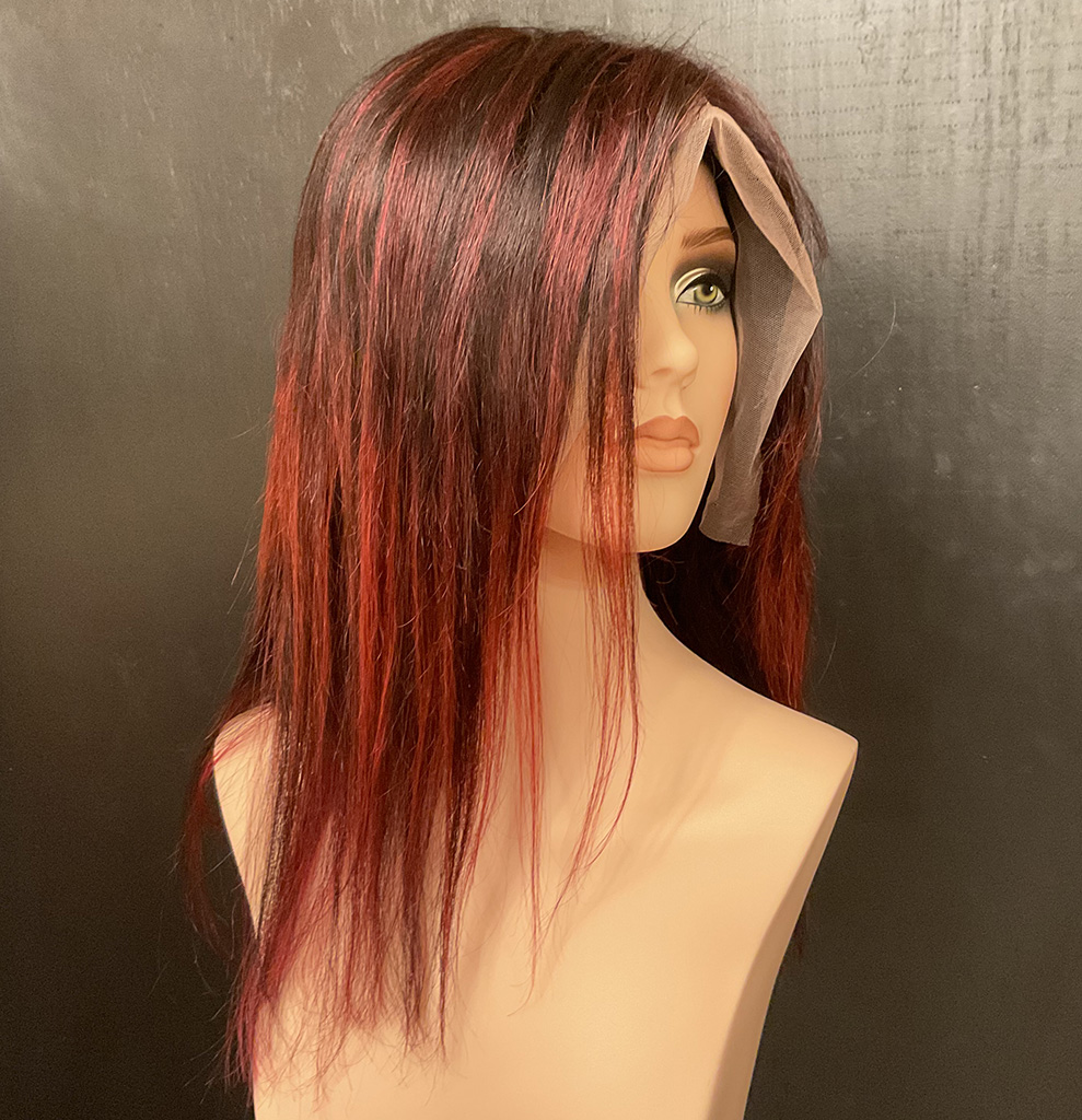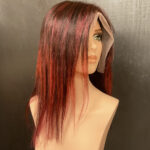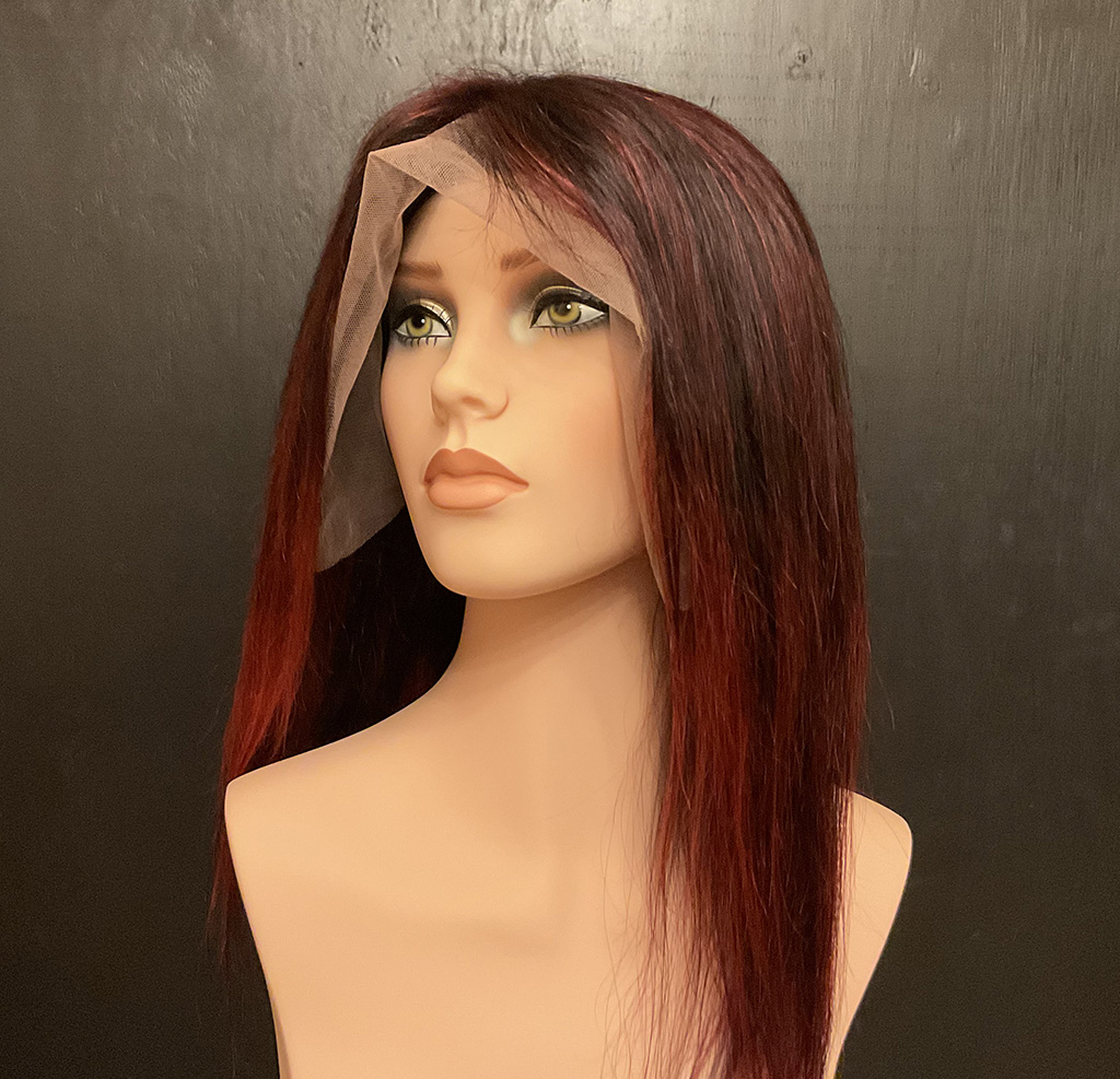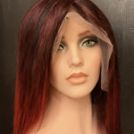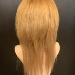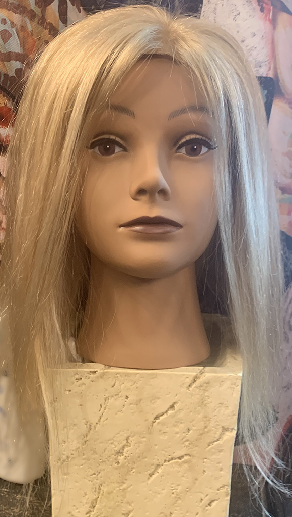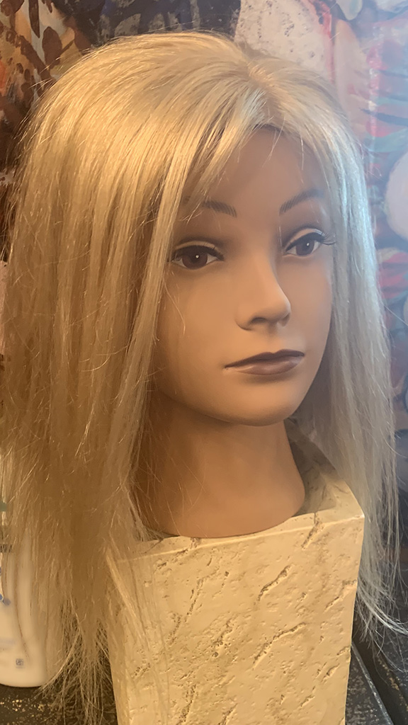 100% human hair wig. Ash blond on light brown base, 22” long, straight hair. 22” wig cap, medium size, 220% density. 13″ x 6″ lace front, combs for secure fit. An adjustable strap can be added for an additional cost
