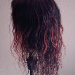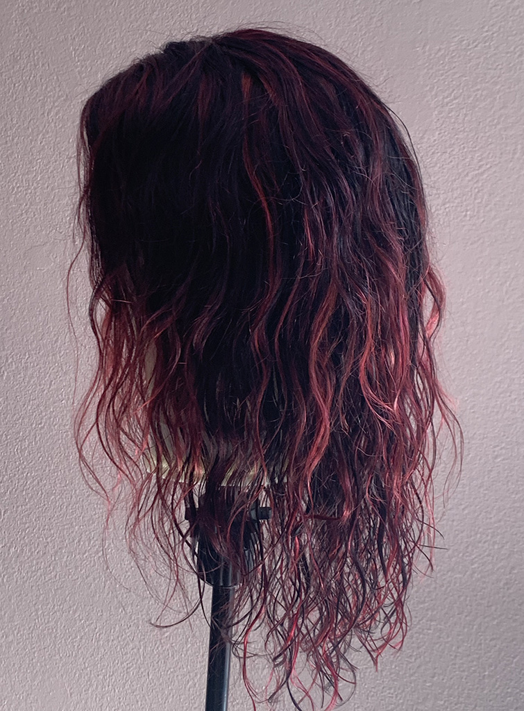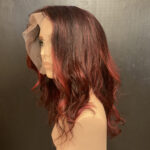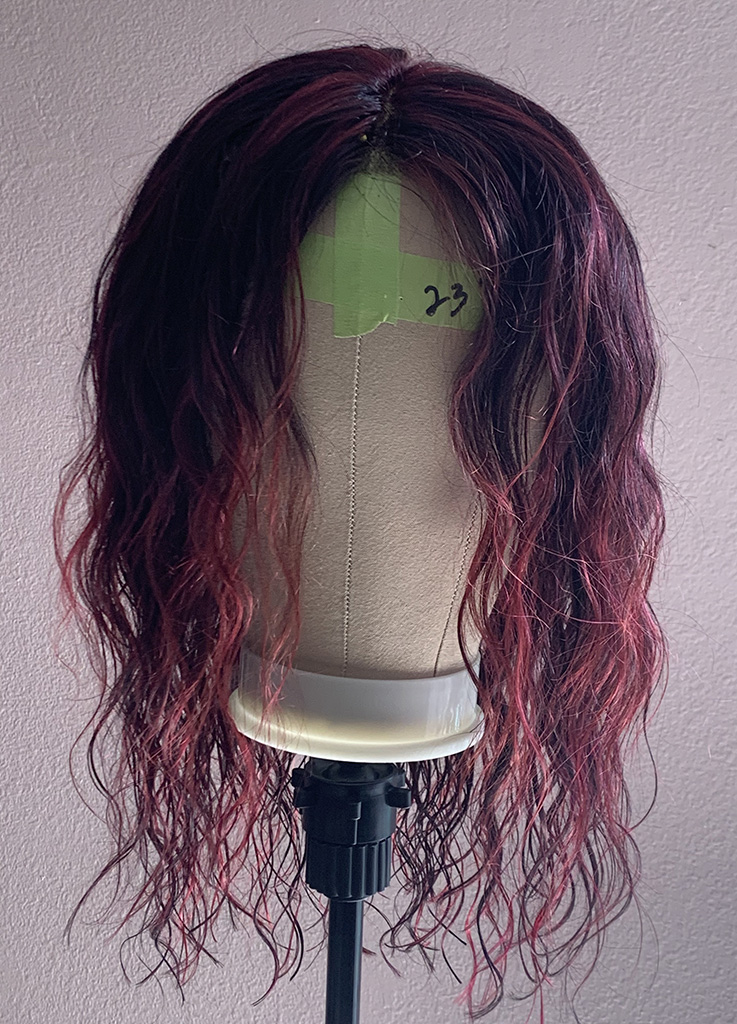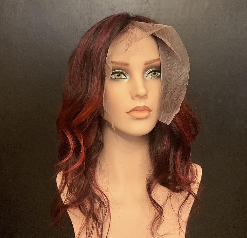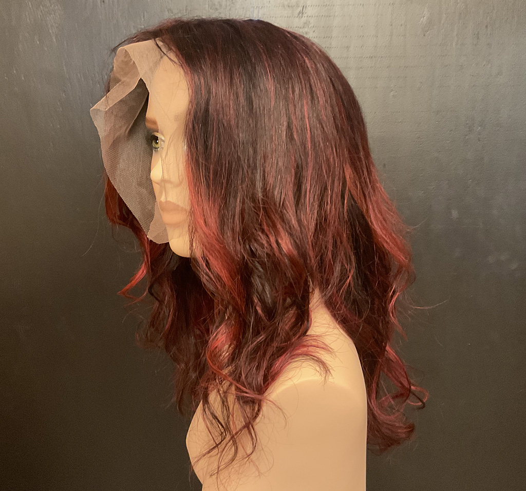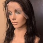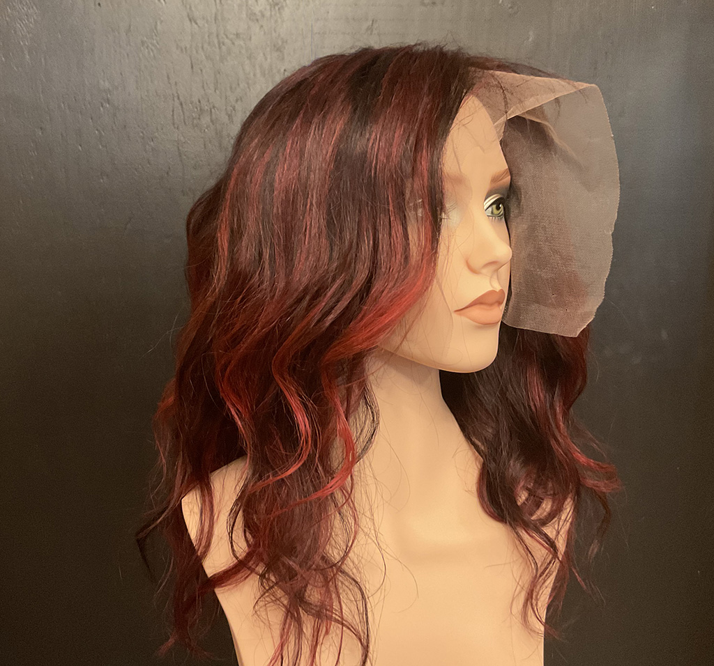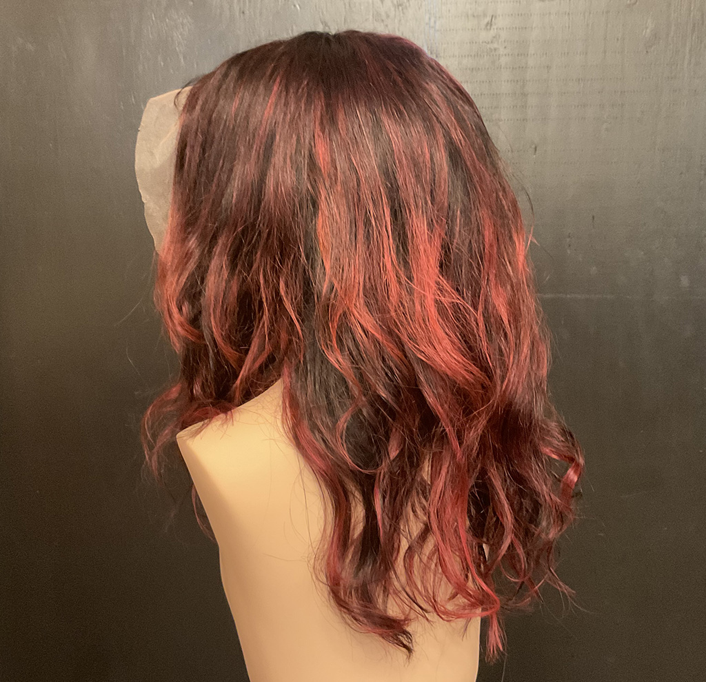 100% human hair wig. Natural, very dark brown, wavy hair, 23” long, 13″ x 6″ lace front, 22” wig cap, adjustable strap, and combs for secure fit. It can be altered after purchase, as the hair is unprocessed.